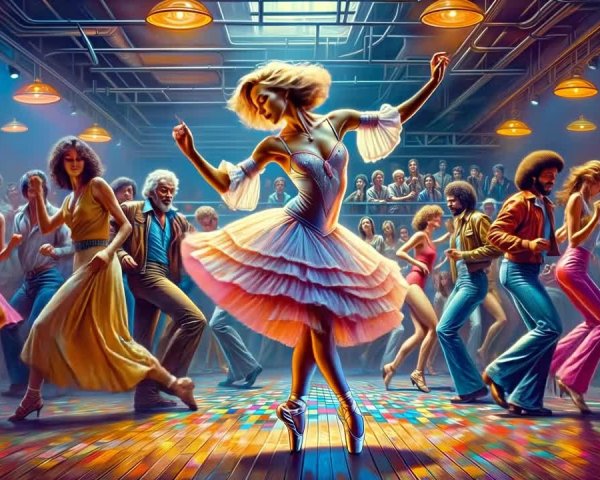 A cheerful ballerina dances rock and roll at an 80s disco.