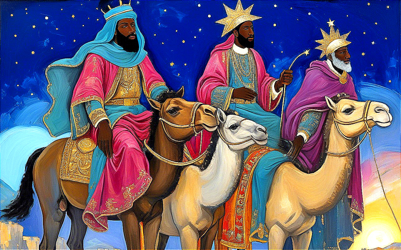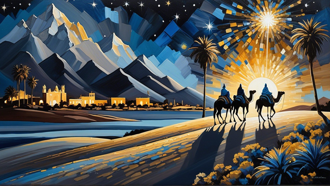 Three Kings and Camels Under Starry Sky