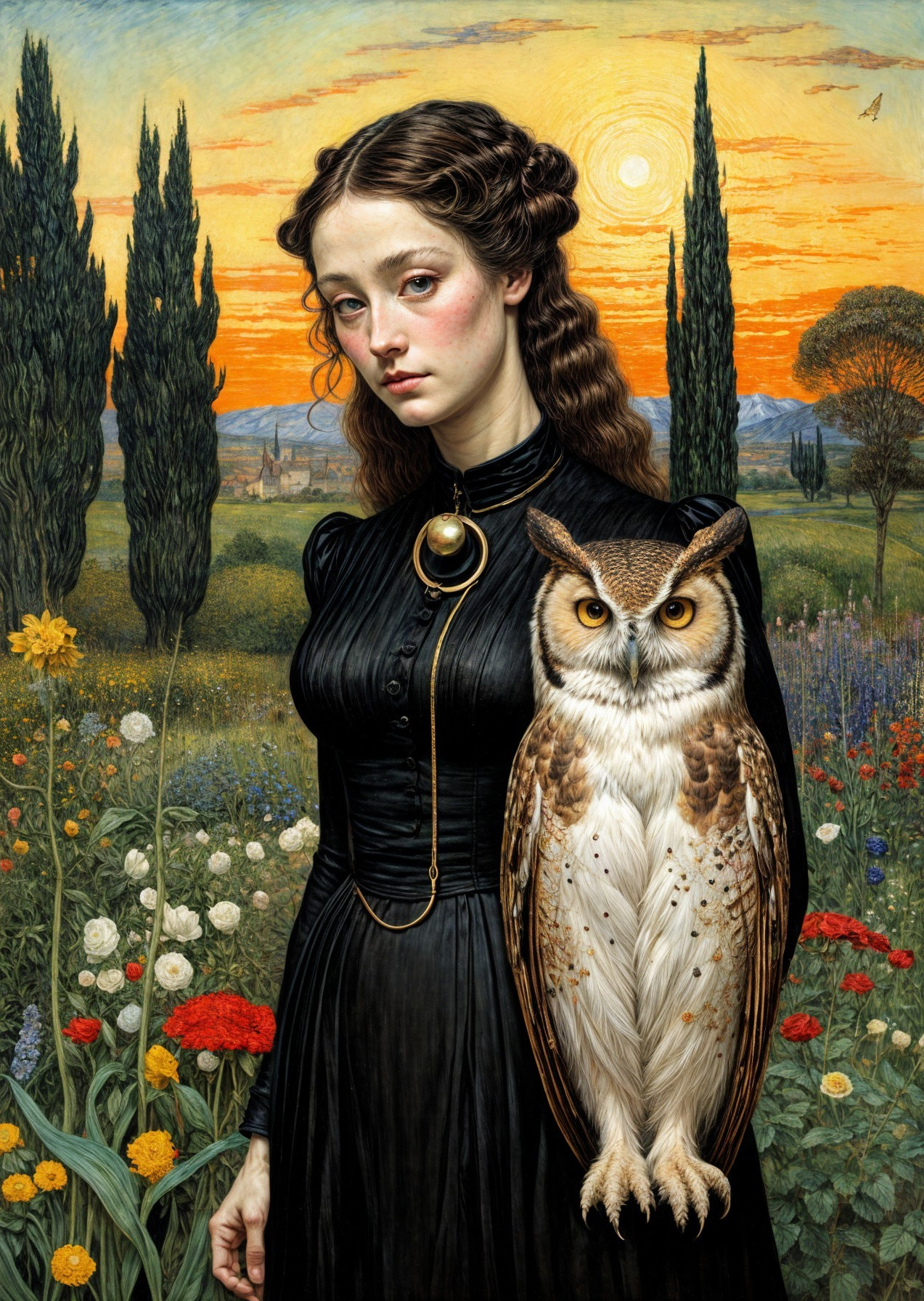 Enchanting Fantasy Garden: Women Walking Owl in 19th Century City