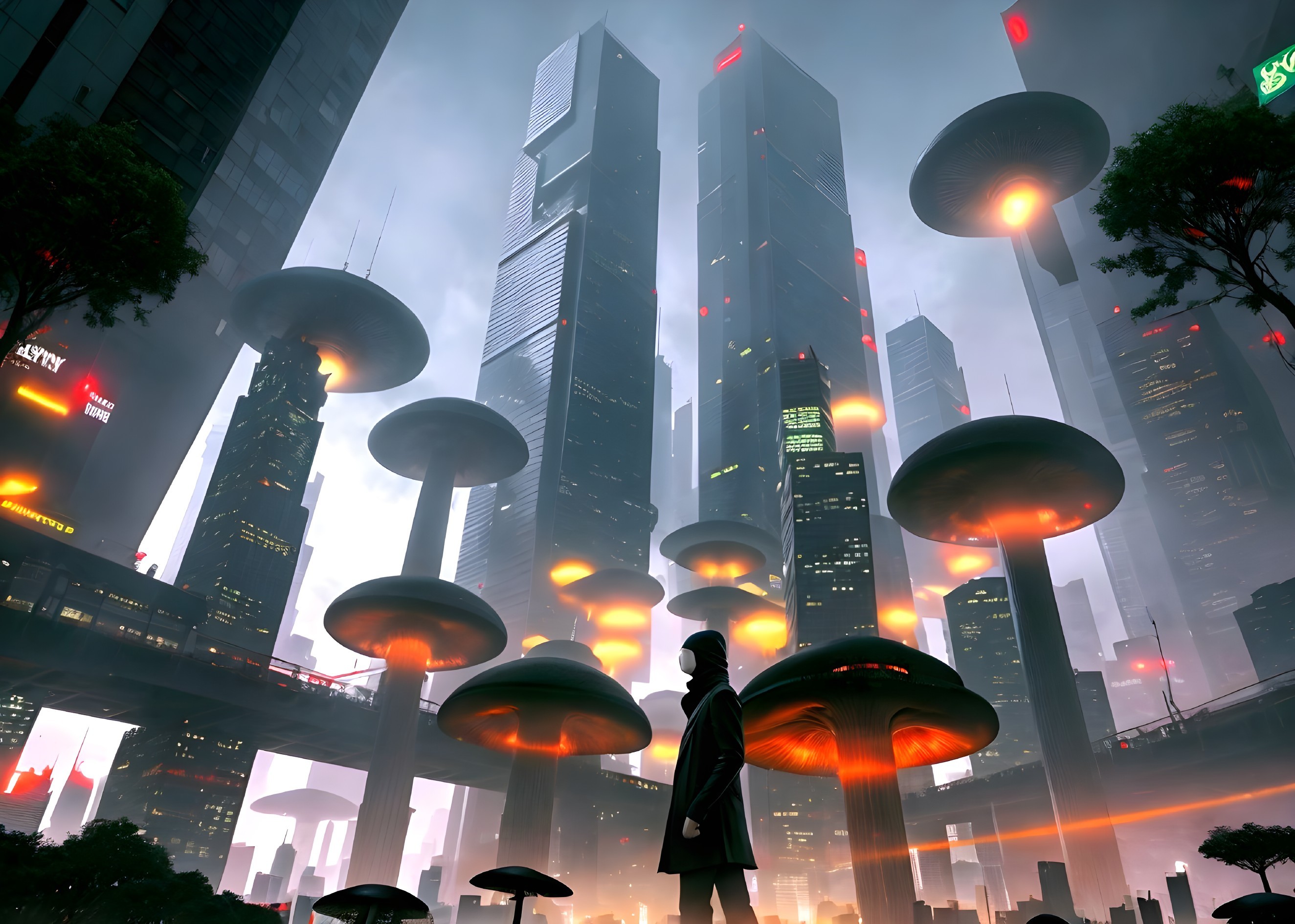 Sky High Mushroom-like SK 273:1122. www.omarsolh.com Futuristic Saucer Over Urban Skyline