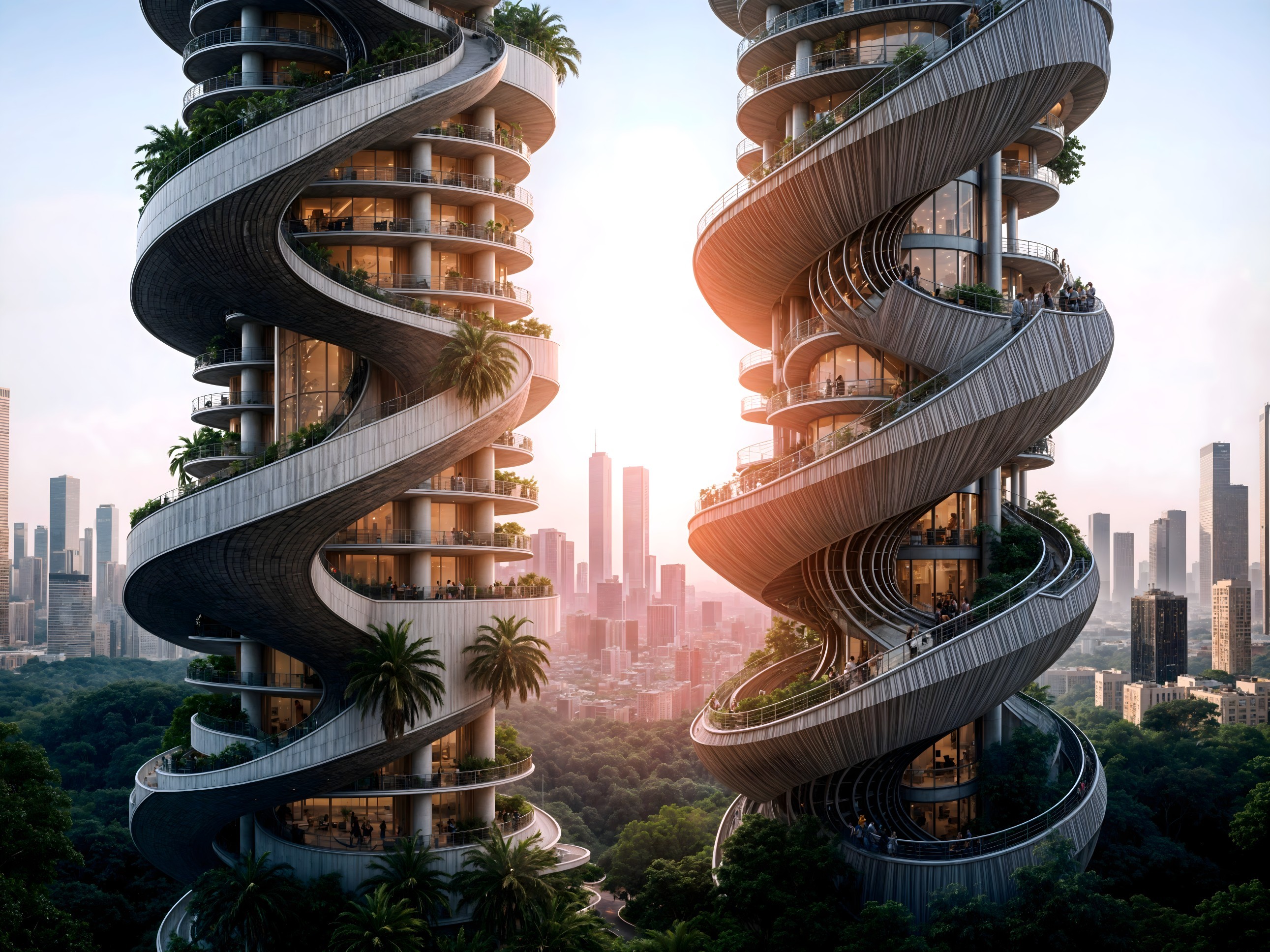 Sky High Gardens SK:194:1125. www.omarsolh.com Sleek Futuristic Cityscape of Spiral Skyscrapers