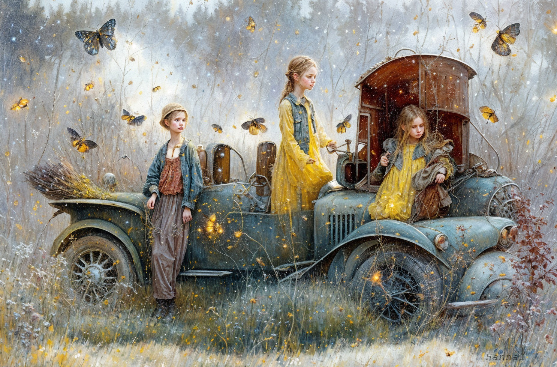 Dreamy Scene with Girls and Vintage Car
