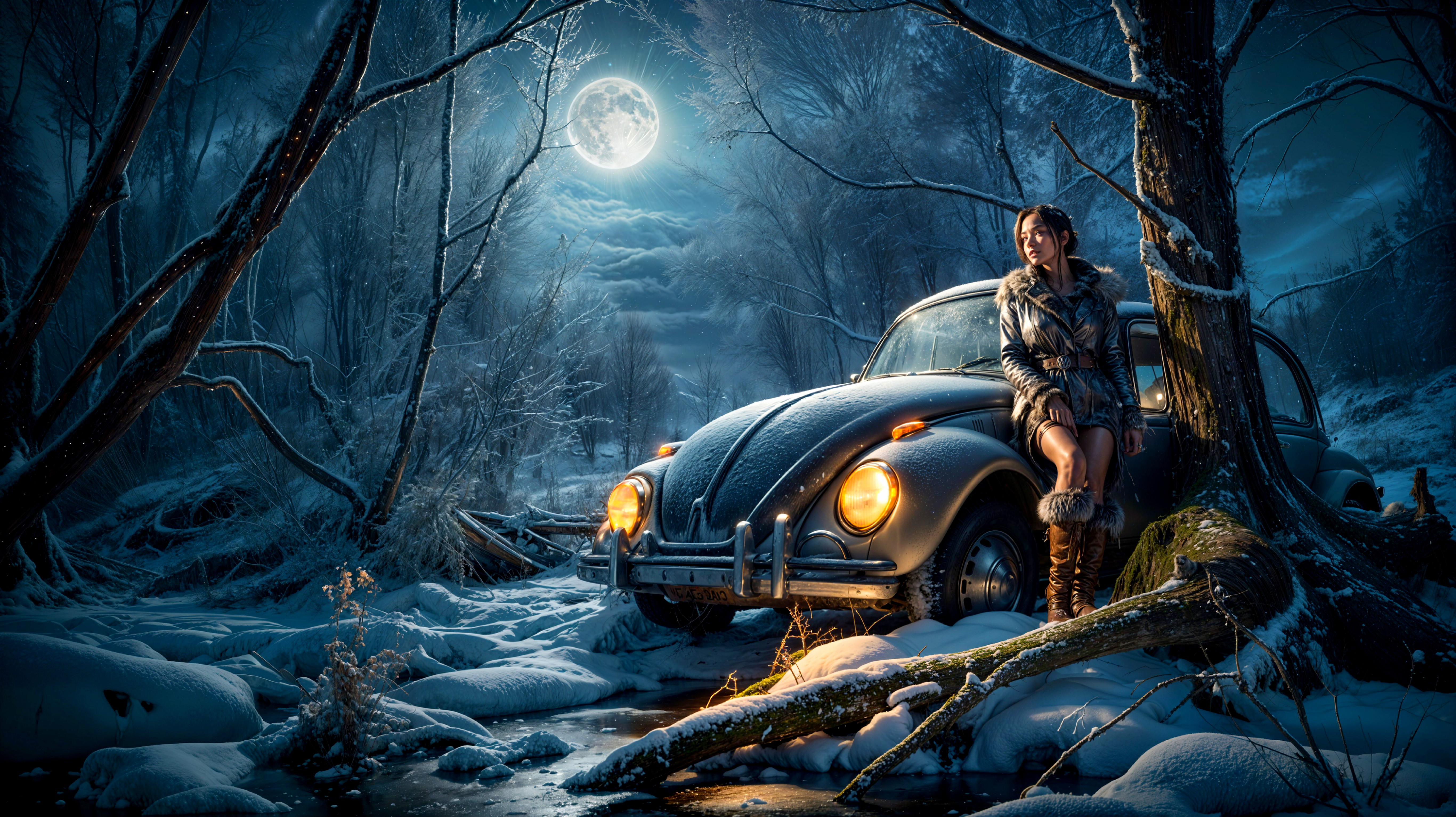 Moonlit Winter Serenity with Vintage Car