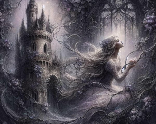 Prompt: A little girl stands on a stony path at dusk, a retro-tendrils-village made from primary vines-colors. Her long, wavy white hair falls down her back. The girl wears a flowing white dress with a delicate lace trim that gently waves around her as she walks. In her right hand, she holds an antique lantern, which casts a warm, flickering light that contrasts with the dim atmosphere. In the background are houses in the artist Jean-Baptiste Monge style. The overall composition captures a sense of harmony, nostalgia, and innocence, evoking a fairytale feel reminiscent of the Middle Ages.