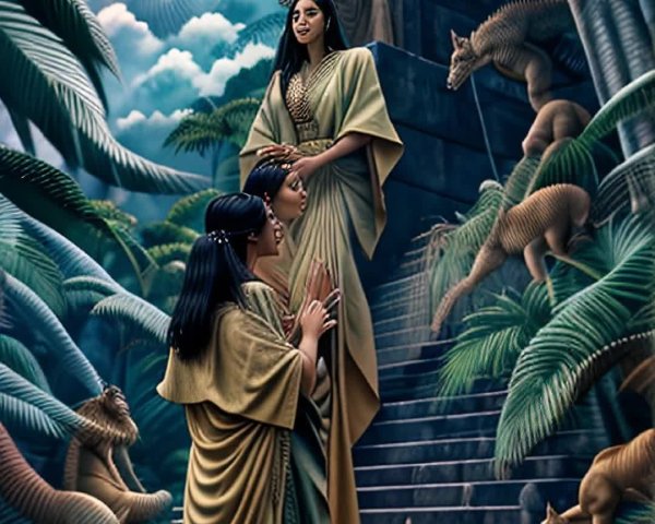 Prompt: A ladder to infinite heights rises through milky-pink clouds before a milky-cyan sky. It's base lies in Tochkaria in the Tarim Basin. Wildflowers wind around the ladders rungs added splashes of vibrant red, angelic ivory, and muted azure.