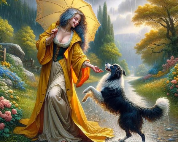 Prompt: Beautiful woman with long wild blue hair in a yellow raincoat is playing with a border collie on a deserted road in the spring rain. Refreshing atmosphere, enjoyment and emotional connection between them.