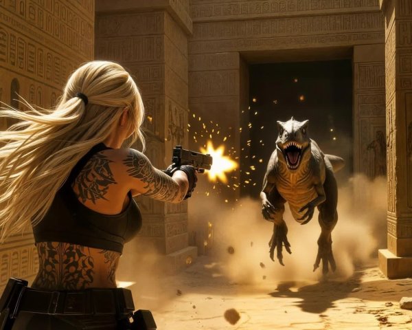 Prompt: A portrait of a woman with vibrant, curly red hair adorned with a small floral accessory stands closely beside a wolf. Her big, expressive blue eyes reflect curiosity and innocence. She wears a flowing orange dress with floral patterns in shades of blue, which accentuates her charm. The wolf, with striking features, displays a mix of gray and orange fur, and its eyes are a captivating golden hue. The background is painted in vivid shades of turquoise and green, creating a serene and enchanting atmosphere that complements the bond between the woman and the wolf. Both subjects are positioned against this colorful backdrop, highlighting their connection and the magical feel of the scene. Style by Helmut Newton x Peter Lindbergh x Nadav Kander