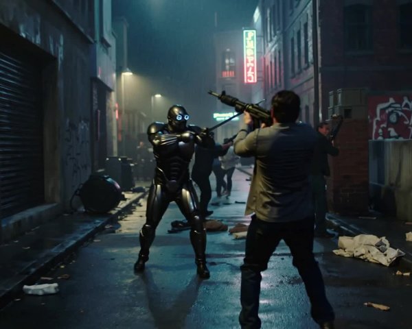 Prompt: A dramatic scene from the Old West, set in a dusty canyon, shows a few bare trees. In the foreground, a stern cowboy in a red shirt stares intently at a group of outlaws, all on horseback. The landscape is rocky and barren, with a vibrant blue sky and mountains throughout. Dust rises, intensifying the tense atmosphere of the moment and capturing the essence of a historic confrontation in the Old West.