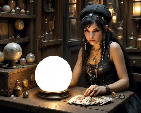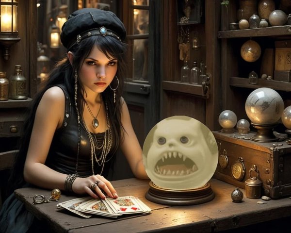 Prompt: In a barren landscape, a girl in a black frilly dress with donkey-like ears sits crosslegged on the ground, while a shadowy figure with similar features looms in the background amid leafless trees.