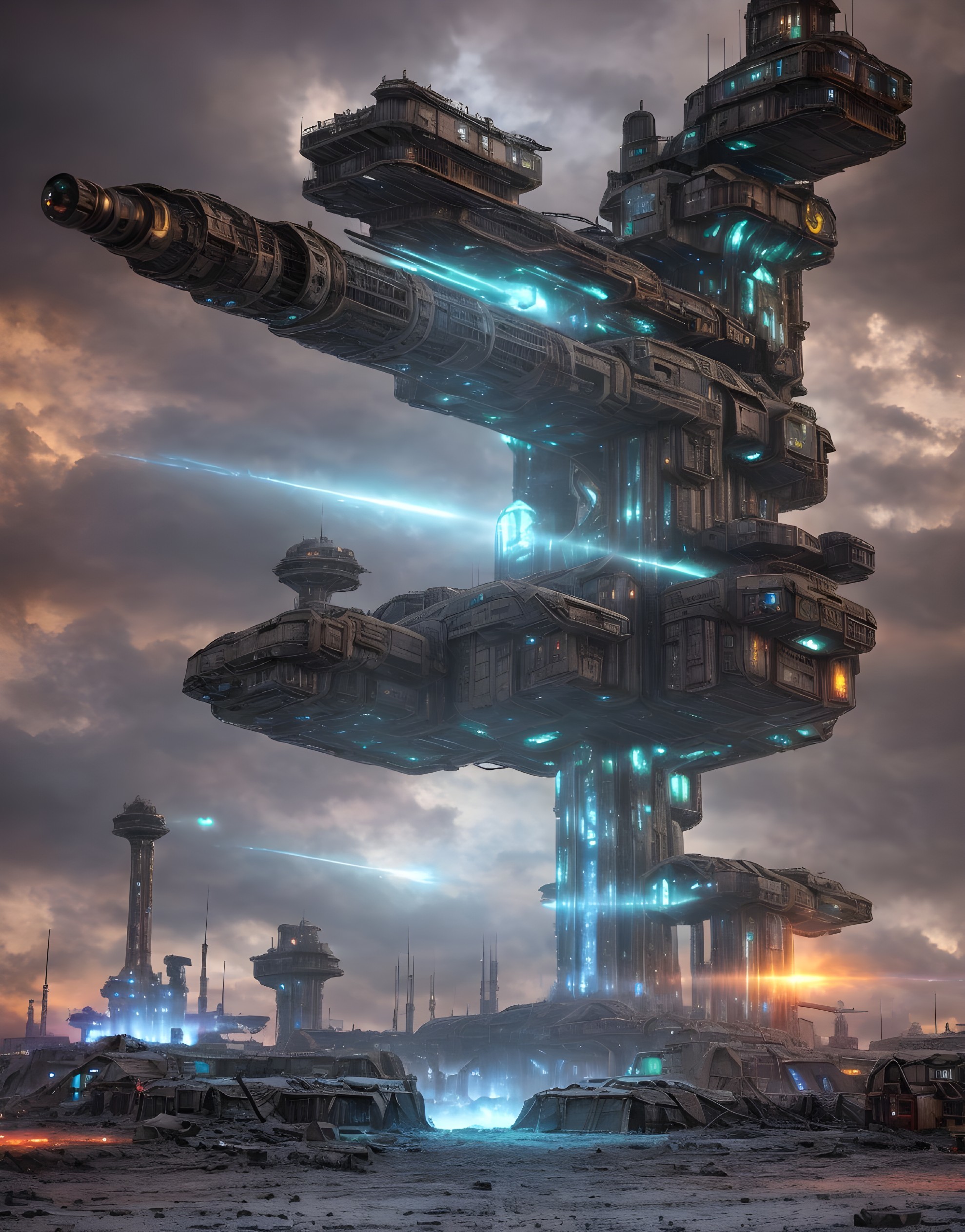 • Prompt: apocalyptic war-torn battlefield, cybernetic alien horde wielding holographic galaxy weapons, sci-fi steampunk, glass, ice, stone fortress, fantasy, iridescent, ethereal, industrial factory