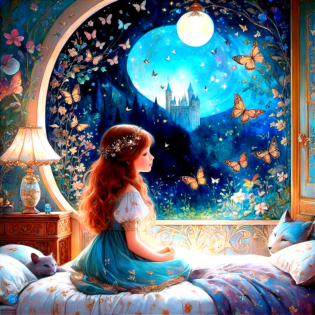 • Prompt: A beautiful lovely young girl in magical fantastic bedroom with whimsical animals, butterflies, fireflies. The bedroom is a portal to the world of dreams. Use the style of Florence Harrison, Yulia Brodskaya, catrin Welz Stein, Rosalba Carriera, pol Ledent, Doug Chinnery, Maud Lewis, Valerie Hegarty, Endre Penovac, Justin Gaffrey. inlay, watercolors and ink, beautiful, fantastic view, extremely detailed, intricate, best quality, highest definition, rich colours. intricate beautiful dynamic lighting award winning fantastic view ultra detailed, 3D high definition hdr