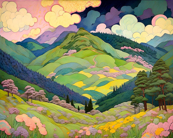 Prompt: Traditional Japanese sumi-e landscape painting in the style of classical Nihonga masters, winter mountain forest scenery. Soft ink washes and delicate brushstrokes depict lynx walking in misty mountains, snow-covered pine trees, bare branches, and one small village house nestled into the hillside. Subtle snowfall drifting through the air. Muted natural palette of ink gray, off-white, pale green, and earthy brown. Asymmetrical composition, negative space, atmospheric depth, tranquil and contemplative mood. Textured rice paper background, hand-painted aesthetic, minimalist yet poetic, timeless Japanese art style.