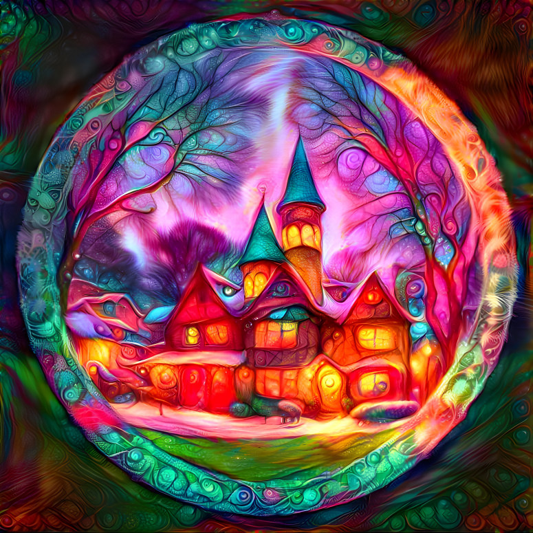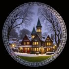 Prompt: on a round canvas, A fairy tale Victorian whimsical village at Christmas. Charles Dickens style with bright colors, Arthur Rackham style, on a round canvas