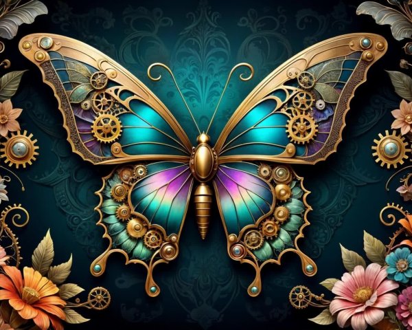 Prompt: Colorful golden and red wet inks of a dreamy landscape with beautiful trees and spotted butterflies with lots of lacy figures on black canvas by Lotte Reiniger depicted in the perfect fractal style of Mandelbrot, Julia, Wassily Kandinsky, Alphonse Mucha