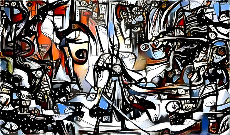 • Prompt: Two Picasso-esque astronauts stand on a Miró-inspired landscape, gazing up at a Warhol-pop Tall Alien. The sky is a Matisse color field, alive with Kandinsky's abstract forms, while the entire scene is densely packed with the intricate, surreal biodiversity of a Boschian heaven and hell.