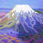 Prompt: *A highly detailed, ethereal oil painting capturing a dreamlike scene. Prominently featured cattails, painted in surreal hues of blue, pink, and violet, and one very tall, elegant stalk of lucky bamboo - smooth, and deep green, with gracefully spiralling and decorated top are arranged in a tall, crystal vase, decorated with intricate patterns. The vase sits on the ledge of an open, vintage window, bathed in soft, diffused daylight. Behind it, mountain slopes rise sharply beneath a clear, bright blue sky, dotted with fiery red and golden maple trees. The scene feels dreamlike, calm, and slightly otherworldly - a poetic moment suspended in time.