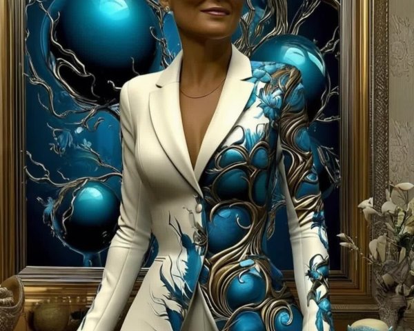 Prompt: A stunning full body portrait in the patchwork-style of Albert Robida, Alice Pasquini, Masamune Shirow and Luis Royo, Abstract oil painting of a beautiful girl, (A striking portrait of a woman with long, flowing hair, adorned in a vibrant orange and blue outfit. Her look is enhanced by intricate accessories, blending fashion with artistic elements), The cozy, warm lighting enhances the intricate details, creating a magical and inviting atmosphere. This artwork is highly detailed, ultra-high definition, ultra-realistic, ultra-vibrant, Popular on ArtStation.