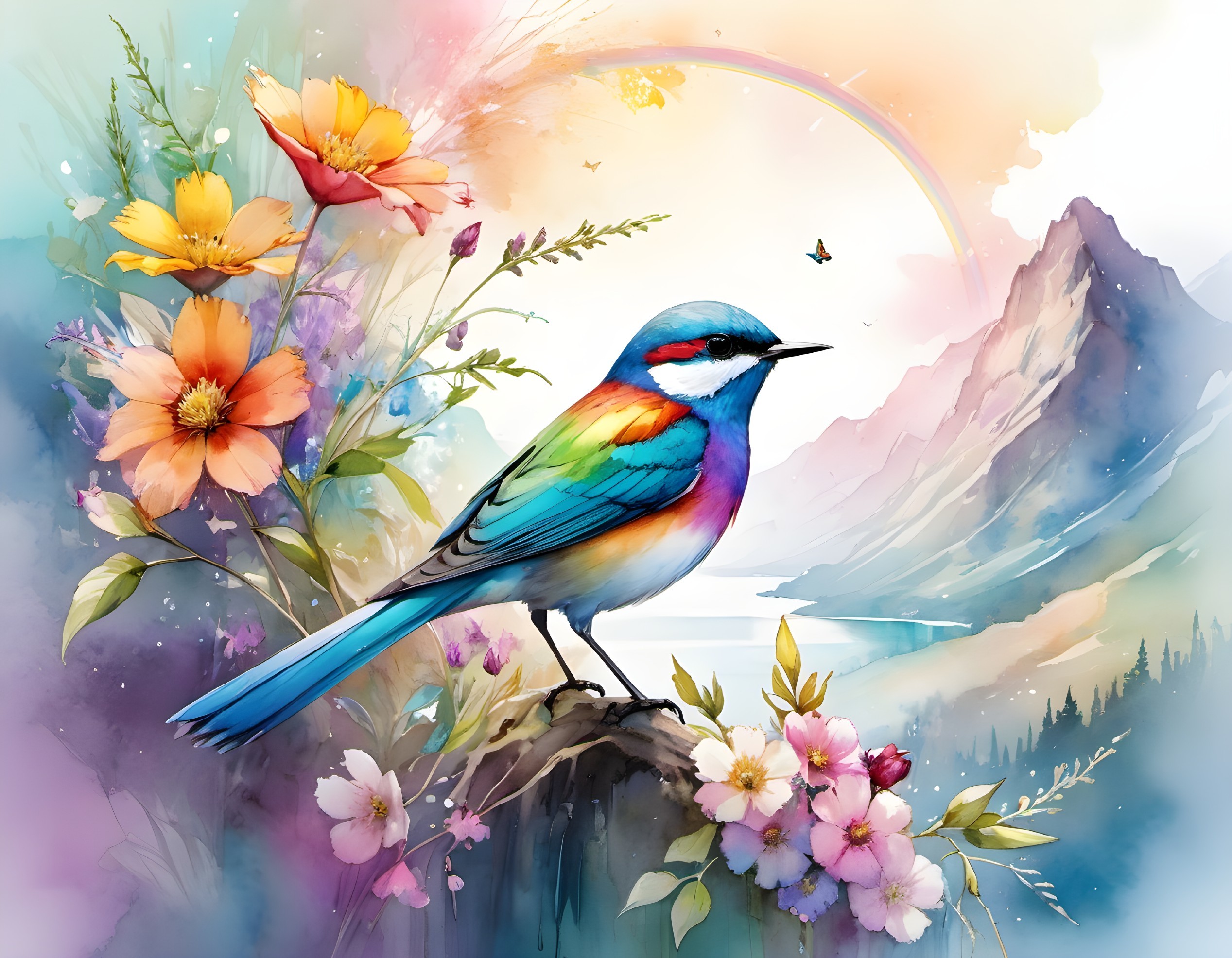 • Prompt: Digital watercolor bird portrait illustration of a beautiful flower rainbow fantasy bird, mountain river wildflowers butterflies in the morning light, by JB, Waterhouse :: Carne Griffiths, Minjae Lee, Ana Paula Hoppe, :: :: Stylized line and watercolor art :: Intricate :: Complex contrast :: HDR :: Sharp :: soft :: Cinematic Volumetric lighting :: flowery pastel colours :: colourful background Josophene wall