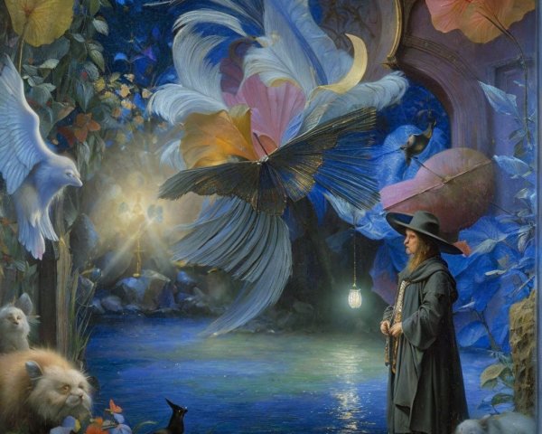 Mystical Scene with Dark-Robed Figure and Animals 12w