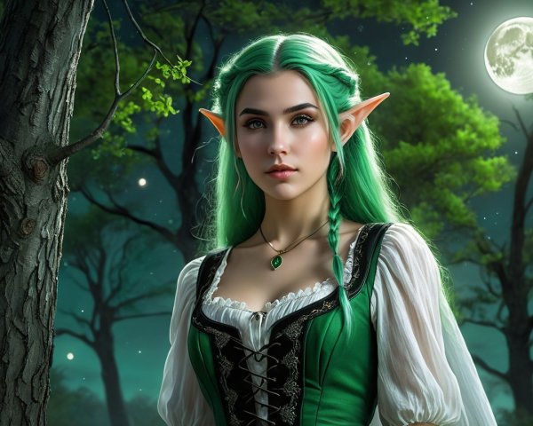 • Prompt: A green haired 18 year old elf female in commoner dress during a full moon near some trees luis royo style