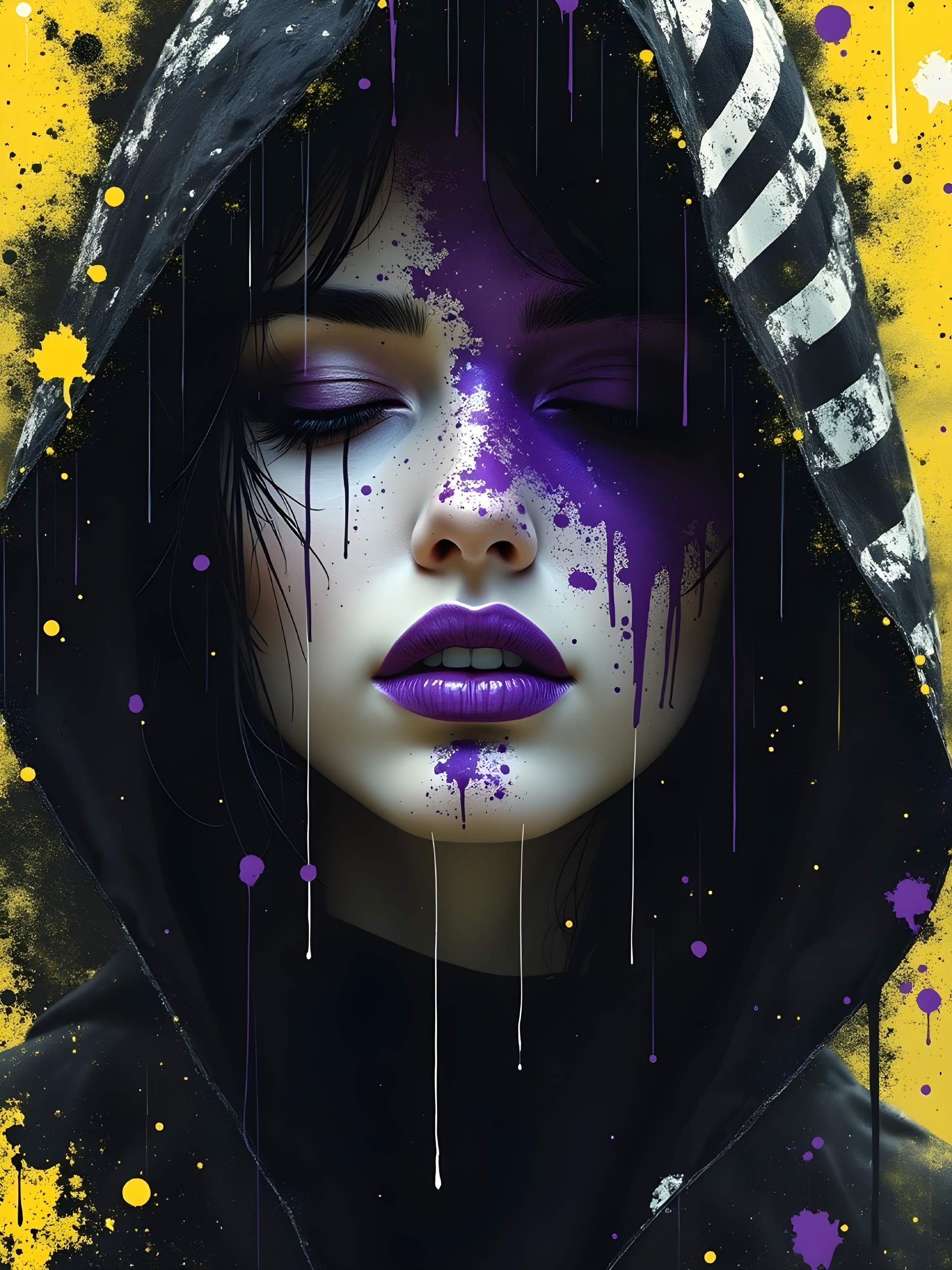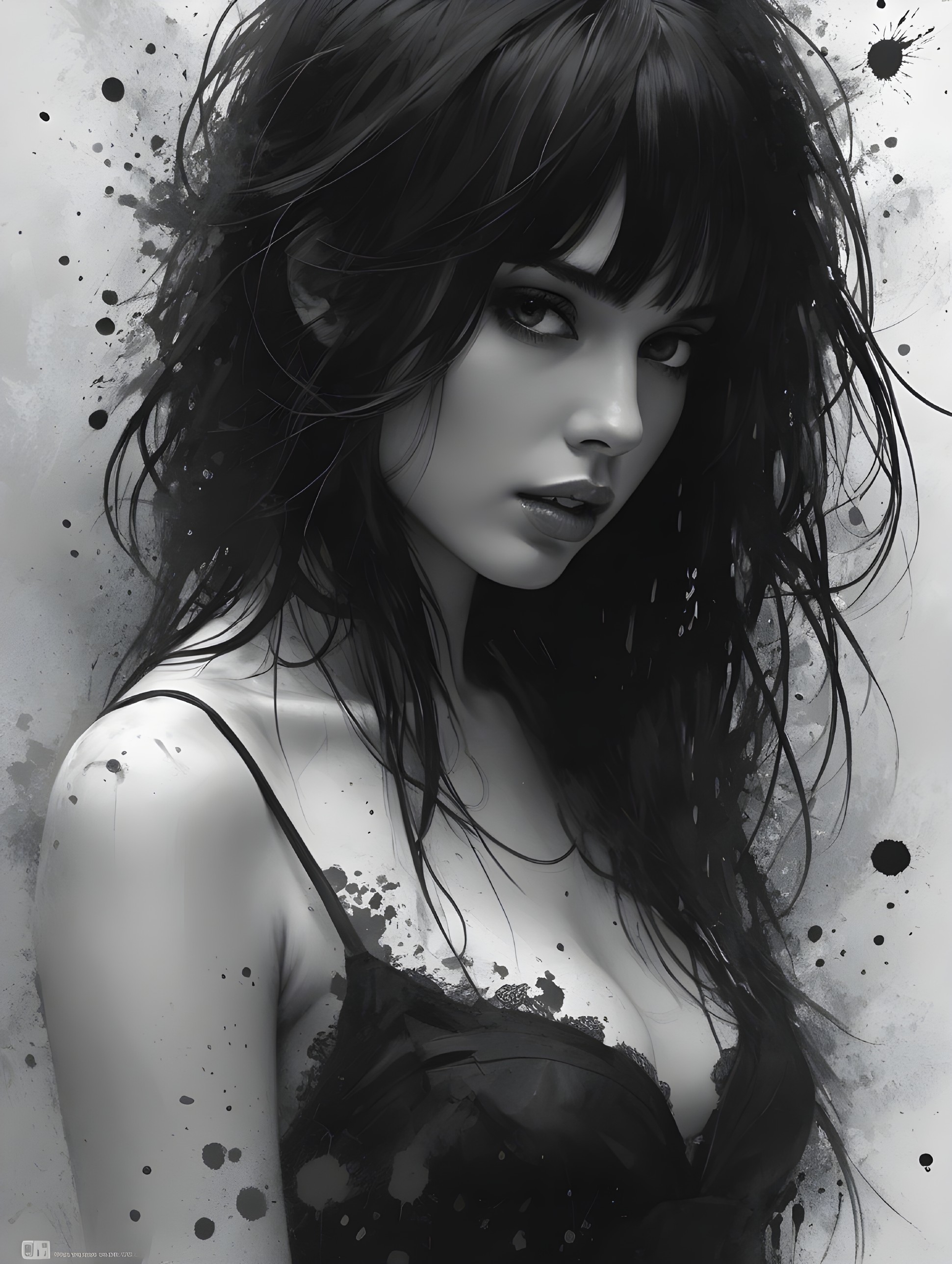 • Prompt: Fair skin beautiful brunette woman, very pretty, black and white yellow speedpaint with large brush strokes and paint splatter, a masterpiece, 8k resolution, trending on artstation, horror, terrifying, highly detailed intricate, artgem.