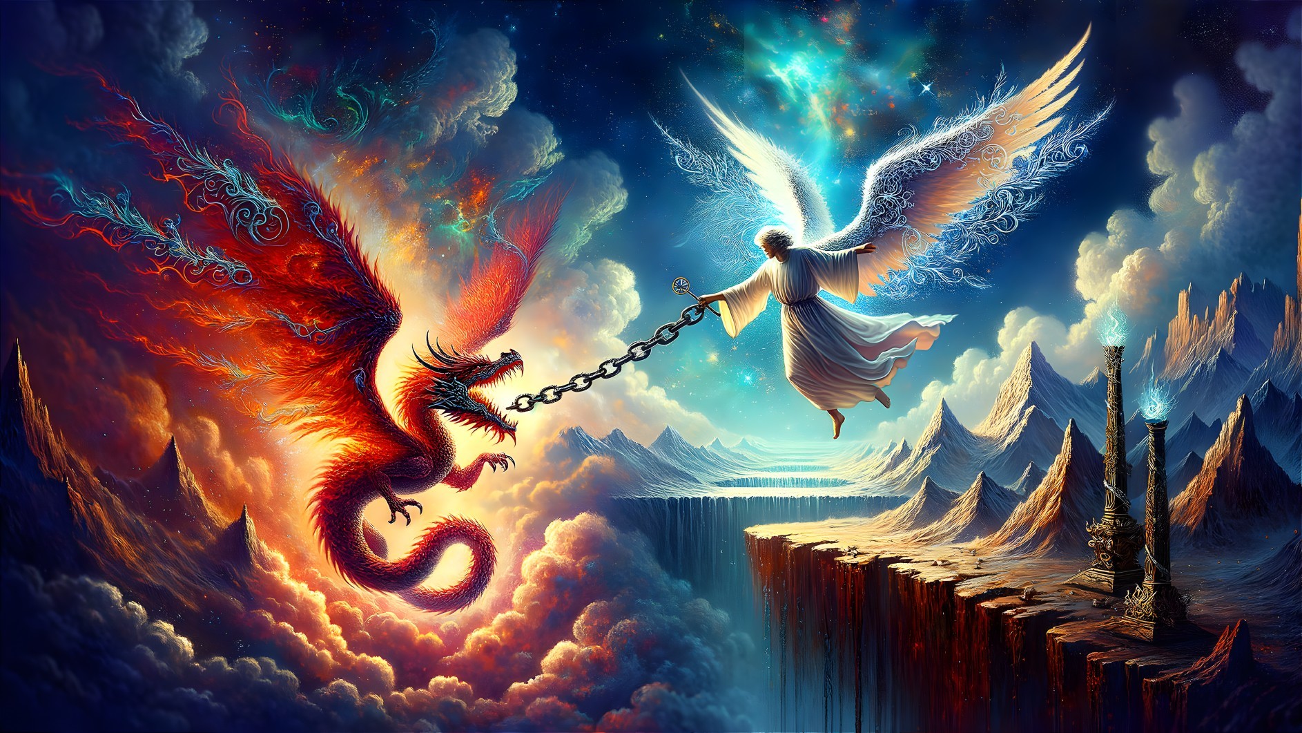 • Prompt: An awe-inspiring depiction of Revelation 20:1-3: I saw an angel, with majestic wings, descending from heaven, holding in his hand the key to the abyss and a huge chain. He seized the red dragon - who is the devil and Satan - and tied him up for a thousand years. The angel then threw him into the abyss.