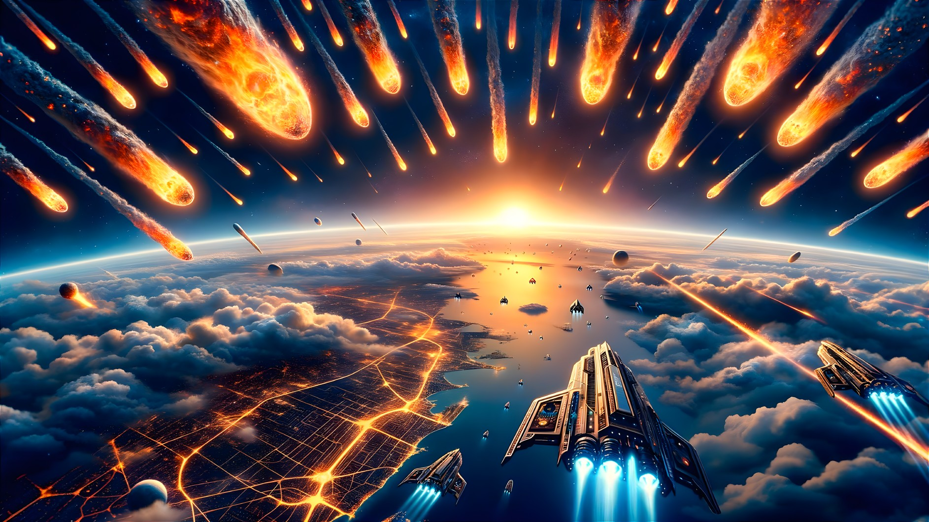 • Prompt: An awe-inspiring depiction of a mass exodus of spaceships leaving planet earth's atmosphere. Framed by fiery meteors falling from space toward the planet heralding in the final destruction of planet earth. The numerous spaceships have futuristic designs to carry humans and cargoes.