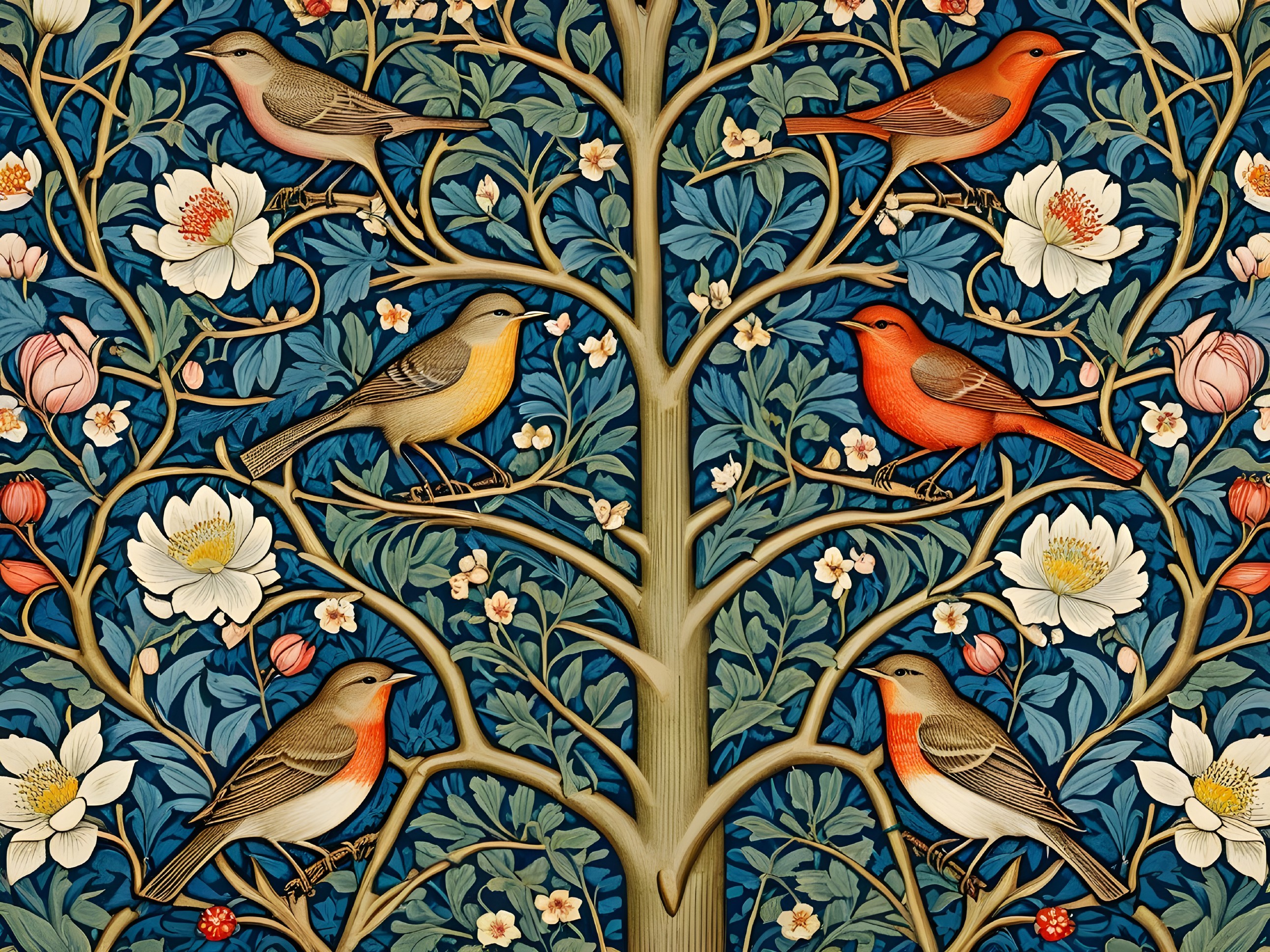 • Prompt: The Kelmscott Tree, by William Morris, in the style of William Morris. The tree has blossom and colourful songbirds in its branches.