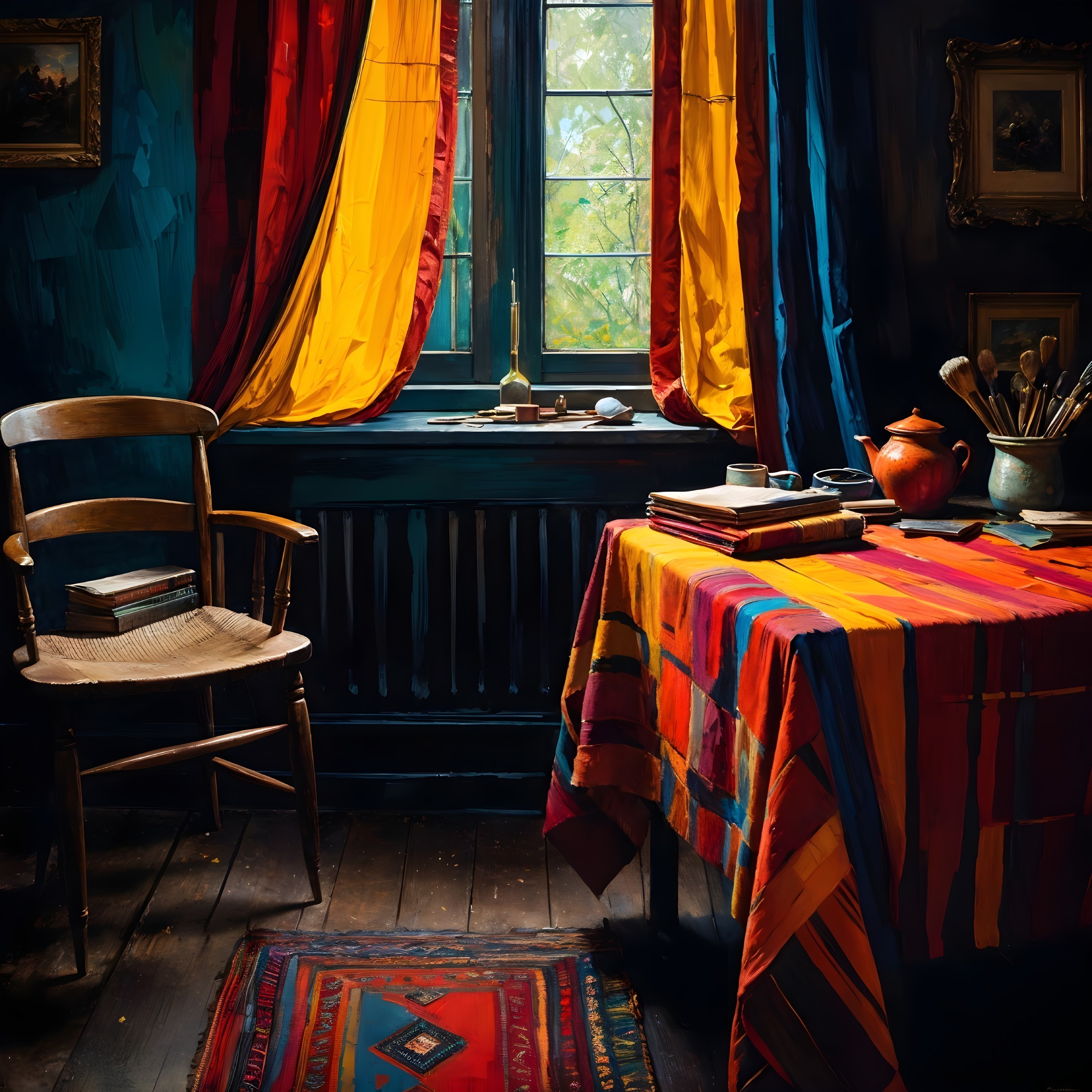 • Prompt: Post-impressionism, drapery, rough and bold strokes, bright colours, dark tones, an Art Station trend, sharp focus, studio photography, intricate details, very detailed, Greg Rutkowski