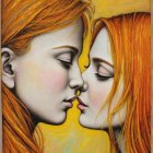 Prompt: The painting has a surreal and dreamlike style characteristic of the artist Richard Burlet. It depicts a group of people or beings with unusual, flattened faces reminiscent of aliens with large, expressive eyes. The color palette consists of bright, contrasting shades of orange, blue, and yellow, creating a deep emotional impact.