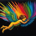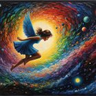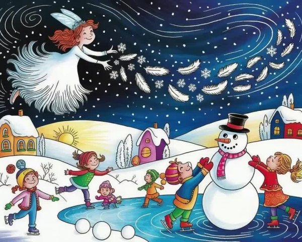 Prompt: A stylistic blend of Dee Nickerson, Klimt, Hundertwasser, and Kandinsky, depicted in swirling blues, vibrant yellows, and radiant golds: Mother Holle, a fairy, shakes out her featherbeds in the sky, which fall to earth as glittering snowflakes. Create an imaginative winter landscape with a colorful, snow-covered scene. In the foreground, children play happily in the snow, engaged in various activities. A large snowman with a black top hat, red scarf, and arms is admired by children in colorful winter coats, scarves, and hats. Two children hold hands, while others eagerly skate on a frozen pond. In the background, gentle, snow-covered hills stretch out, dotted with simple, charming houses with colorful windows. A majestic, radiant sun spreads warmth and harmony against a deep blue, star-studded sky. The trees are bare, their white branches contrasting with the vibrant colors. Gently swirling snowflakes drifting down enhance the atmosphere and create a magical winter wonderland.