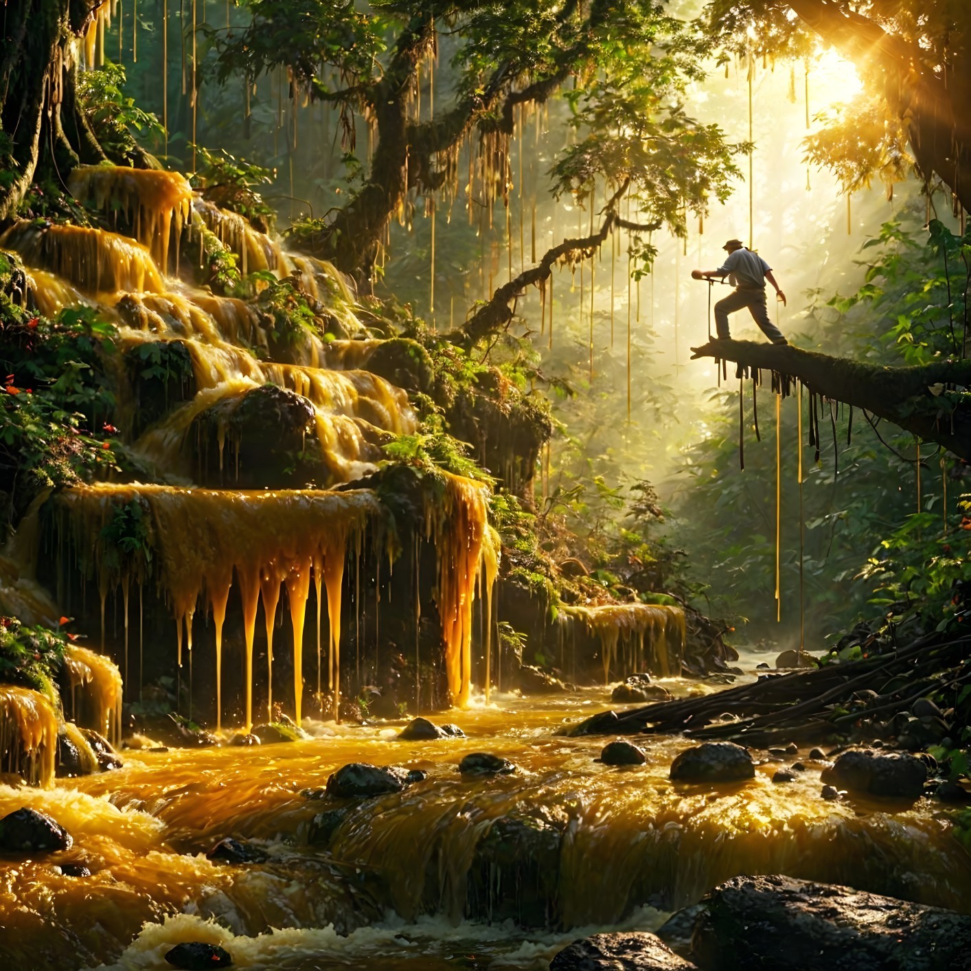 Prompt: Nature's grandeur through the eyes of a stout man standing atop a waterfall of mucous and maple syrup in the the jungle. Conveying the fleeting moment of human audacity against the timeless flow of stickiness and grease—a symbol of nature's eternal slickness, snot on a doorknob as it were. The lush greenery enveloping the scene whispers tales of the untamed, the unseen, and the unexplored, inviting the viewer into a realm where the human spirit confronts the sublime, blowing one’s nose while eating breakfast.