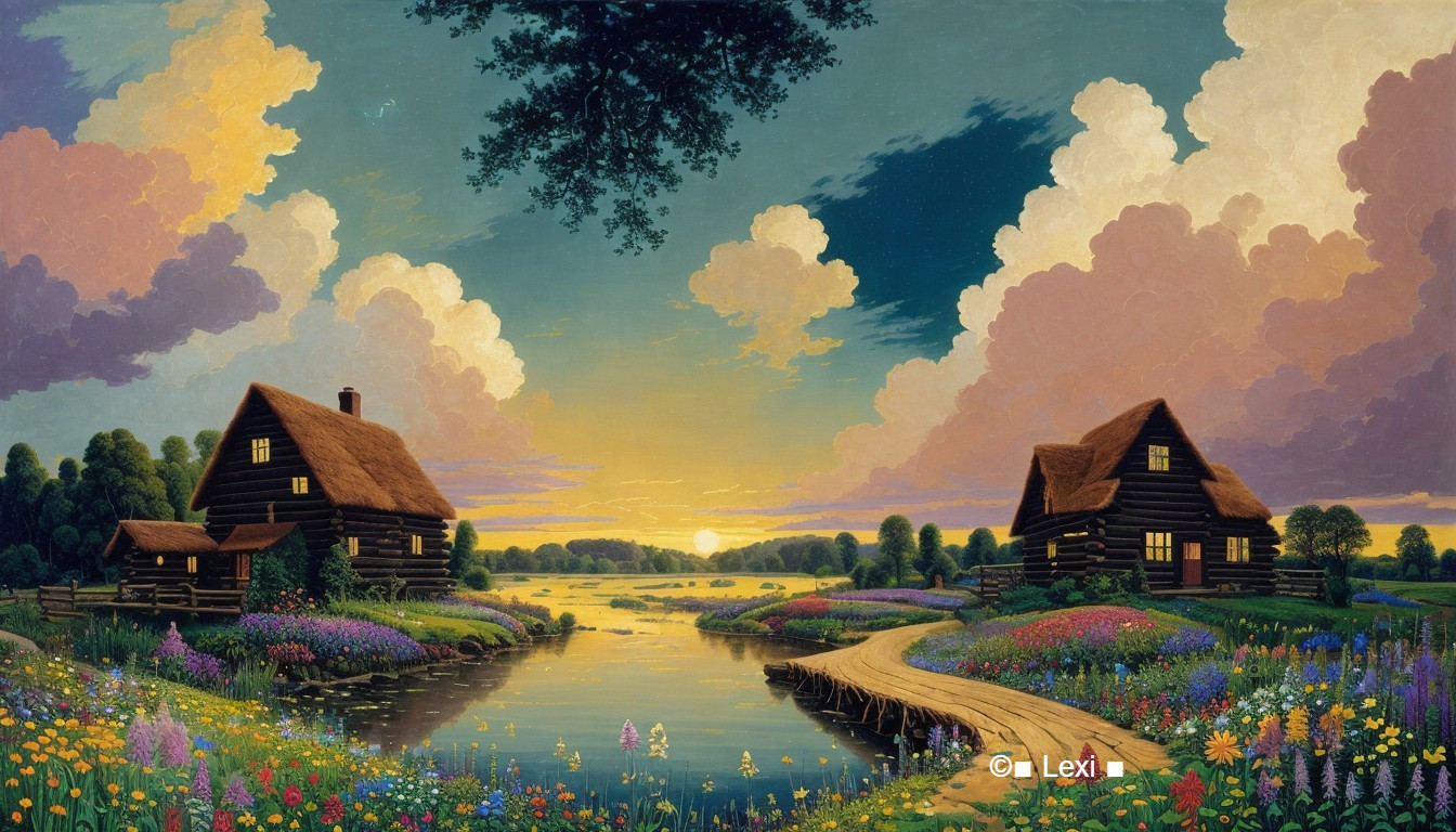 Prompt: Mind-blowing Landscape, an old log cabin surrounded by vibrant wildflowers, with a brick road leading to a serene lake. a picturesque landscape with magic clouds + MASTERPIECE+ in the style of , DEBBIE CRISWELL" patchwork by Paul Nash, Samuel Palmer and Georgia O'Keeffe: nocturnal scene