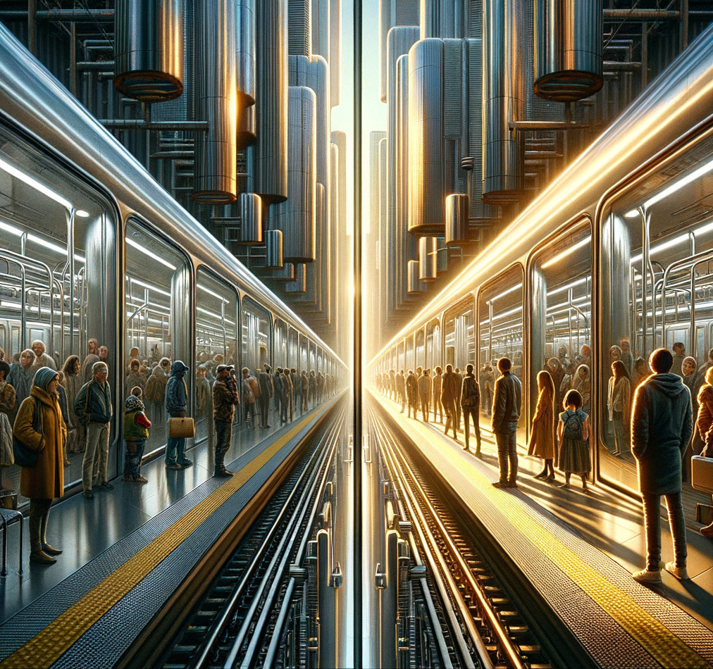 • Prompt: "In the style of Richard Estes, envision a scene from the future portrayed through the train window. On the left side of the train, passengers stand inside, while on the right side, passengers are on the platform. Through the window, there is a detailed depiction of the gaze transitioning between two worlds, with a clear emphasis on passengers blended between the train's interior and the platform. Lights and reflections create a dynamic interplay of light, making the scene intense and futuristic."