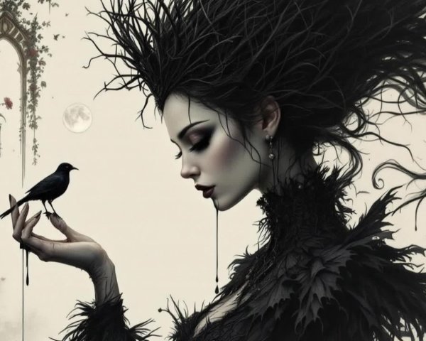 Prompt: A masterpiece of art: a surreal, conceptual fashion portrait. A woman's legs and heels, elegantly posed, peek out from under the brim of an oversized, wide-brimmed hat, adorned with an appliqué of black roses and a fine white pearl liner. The figure sits on a crescent moon, the textured surface of which is intricately rendered. High fashion, a monochrome palette of black, white, and gray. Spotlights highlight the texture of the moon's surface and the fabric of the hat, creating dramatic shadows. Symmetrical composition, central subject, eye-level perspective. An enigmatic, sophisticated, and slightly theatrical mood creates a sense of mystery and enchantment. A torrential rain falls from above, dripping everywhere, the hat, the crescent moon. Fine detail, photographic realism with surreal elements. Silk, wool, leather, textures of the lunar surface. Photorealistic detail, 8K. 8K"