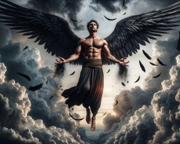 Prompt: Ominous evil god, towering and menacing, dark and powerful, holding crackling lightning aloft, massive storm clouds swirling overhead, dramatic and fierce atmosphere, mystical and otherworldly, digital illustration, high detail and intricate design, dynamic composition, dark color palette with flashes of electric blue and purple, dramatic lighting casting deep shadows and highlights, by H.R. Giger and Brom, Artstation.