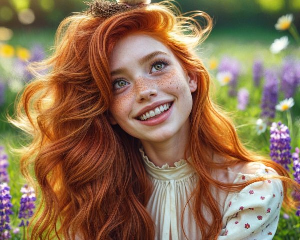 Prompt: A girl with bright red hair and charming freckles sits in a quiet meadow decorated with purple flowers. A small yellow chick playfully rests in a nest on her head, and she smiles, looking up joyfully.