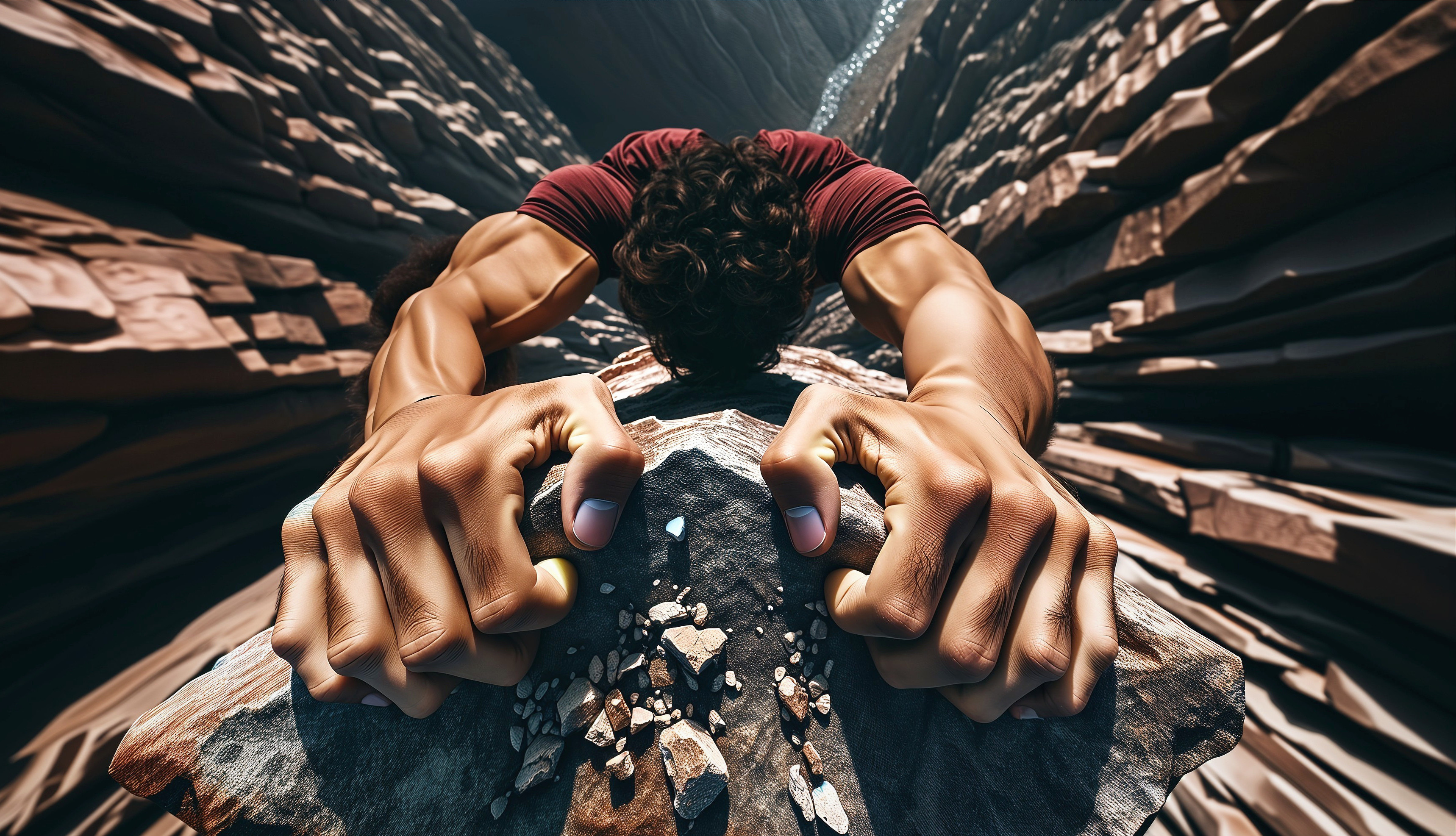 • Prompt: A dramatic top-down close-up of a man gripping the edge of a towering cliff with both hands, his fingers tightly clutching the rough, jagged rock. His knuckles are white from the strain, and small pebbles crumble away beneath his grip. Below him, the dizzying drop fades into a blur of rocky terrain or a deep abyss. His arms are tense, veins visible, showing the desperate struggle to hold on. Wind whips through his hair, adding to the intensity of the moment. The image captures the raw tension of survival, strength, and the will to keep going.