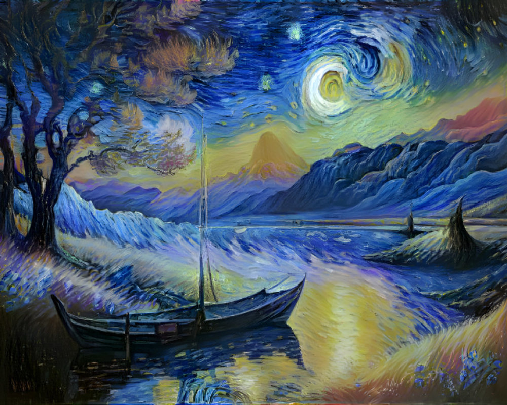 Colorful swirling starry sky, fiery trees, calm lake, boats, mountain backdrop art.