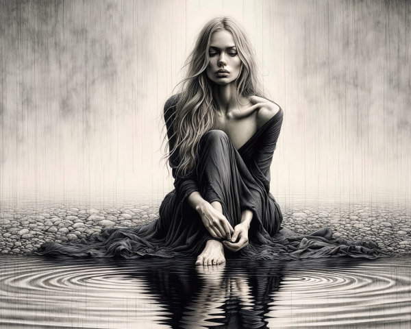 She keeps her silence by the lake, where each falling leaf remembers what the heart cannot say.