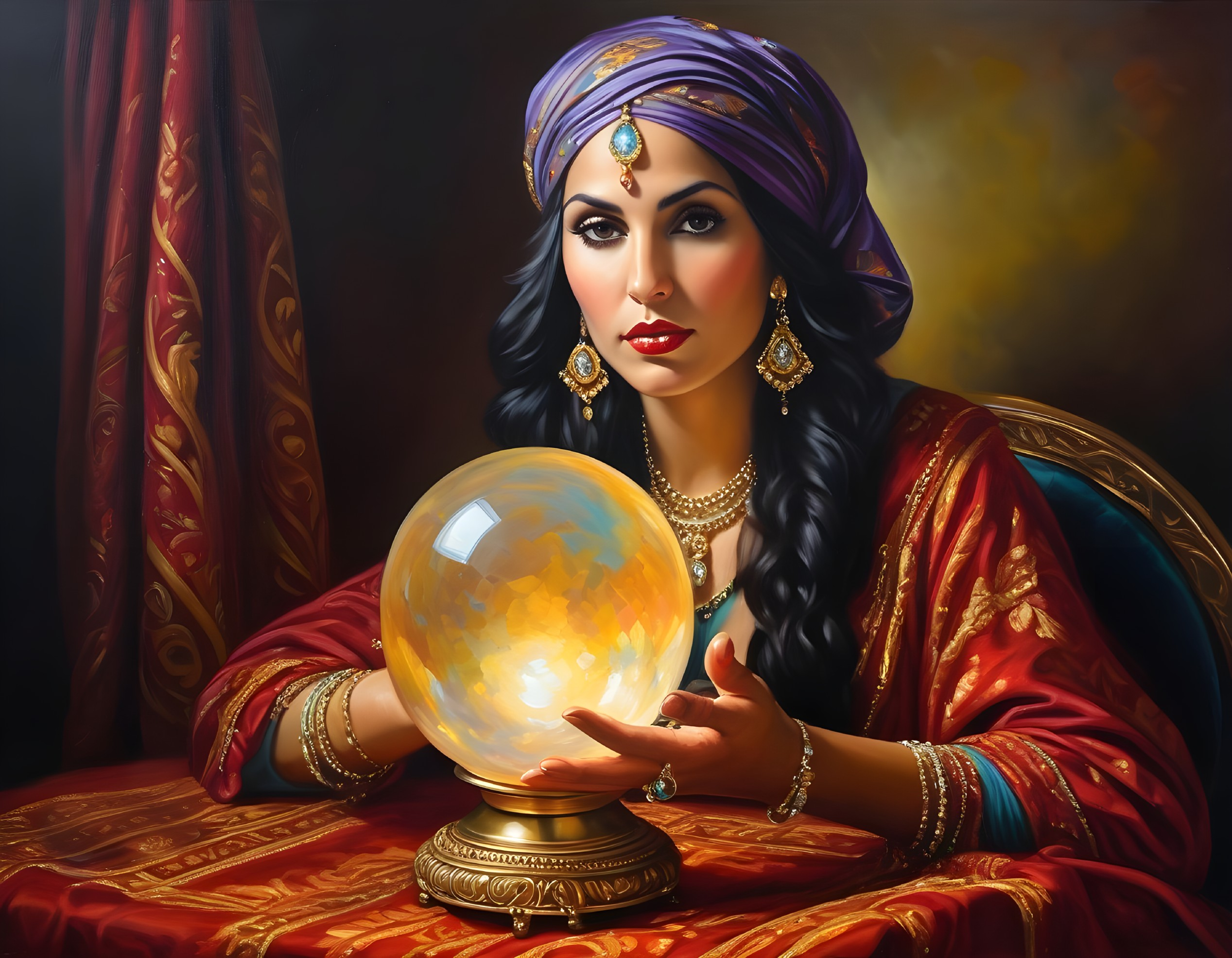 • Prompt: An oil painting capturing a beautiful gypsy fortune teller with a crystal ball on a gold stand, styled after the artistic brilliance of Carppacio, striving to highlight the power of asymmetry of information, finding inspiration in the way it impacts the existence of brilliant creative minds dwelling in a realm of enchanting fantasy, elevated by the process of creation, absorbing a sense of beauty, profound emotions, realistic yet veering towards surrealism, evoking memories of Dali and the styles of Andrey Remnev, Sergey Marchenko