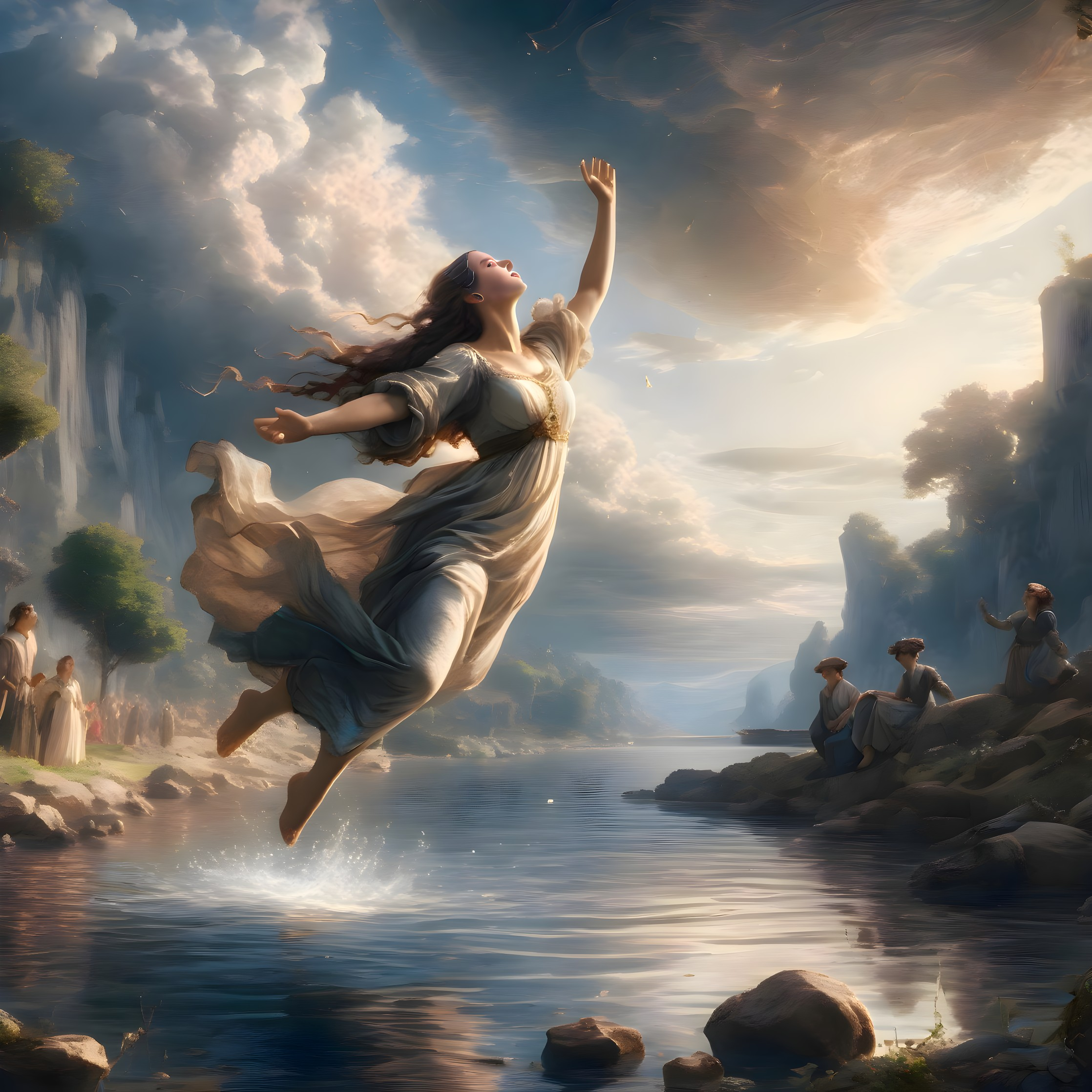 Ethereal woman in flowing robes ascends among awe-struck people in picturesque landscape