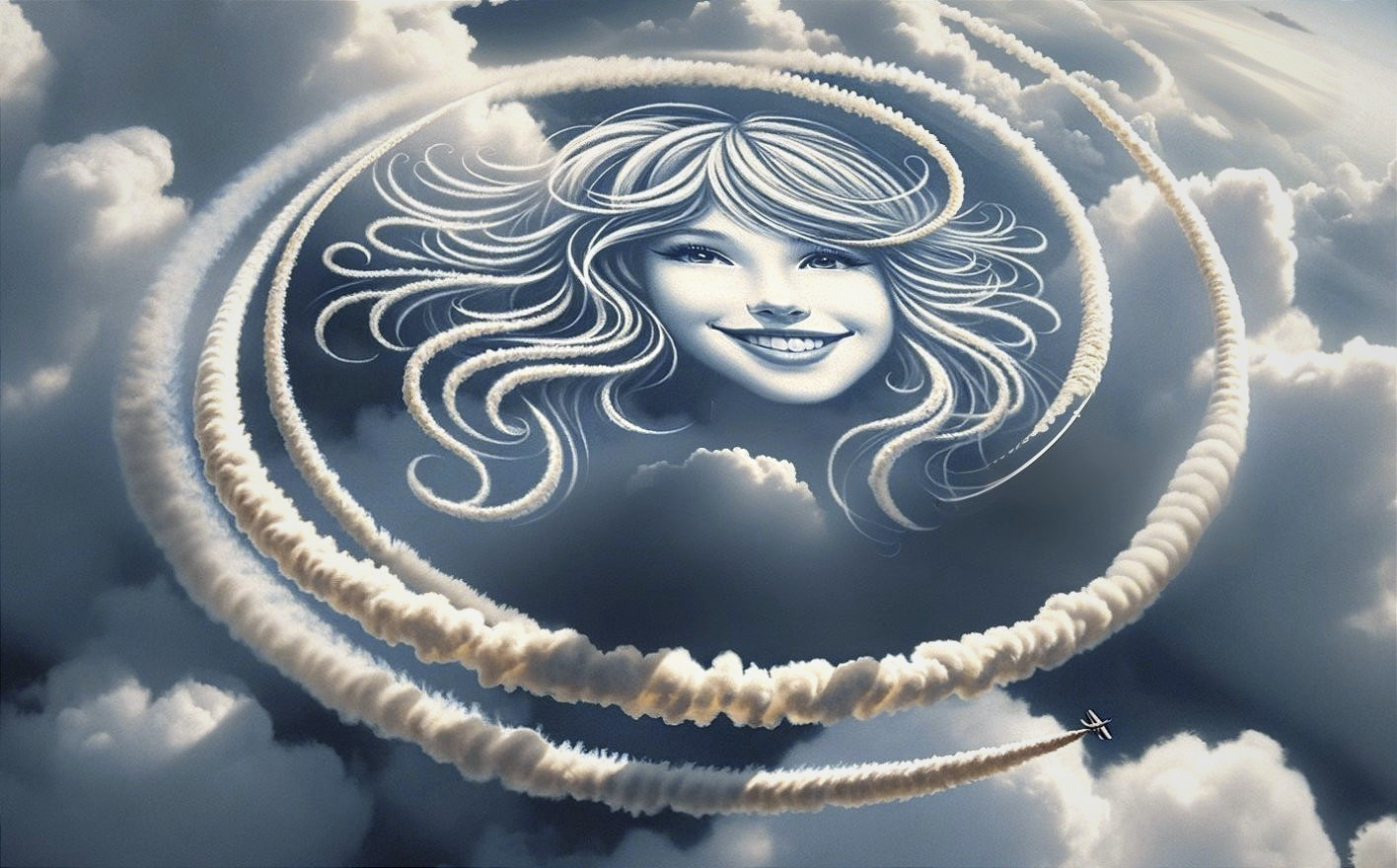 • Prompt: A small airplane is flying in the sky and making loops, and its loops draw the face of a girl with long hair and nice smile, and it also draws a little hart, simple happy image of love and joy