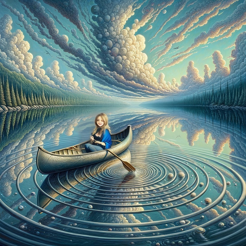 Surreal image: Woman in canoe on mirror-like water with forest and whimsical sky
