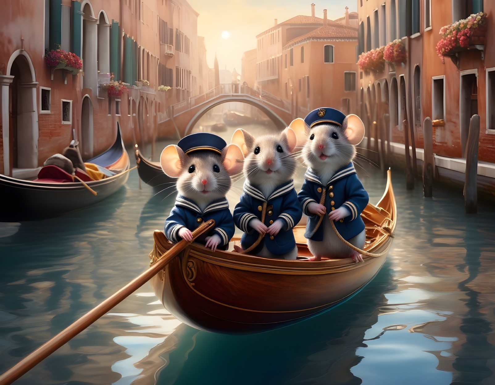 • Prompt: two little cute mice, in sailor clothes sailing on the Venice in a gondola, painting, fantastic realism, delicate light reflections, stunning details,beautiful colors, detailed beautiful animals