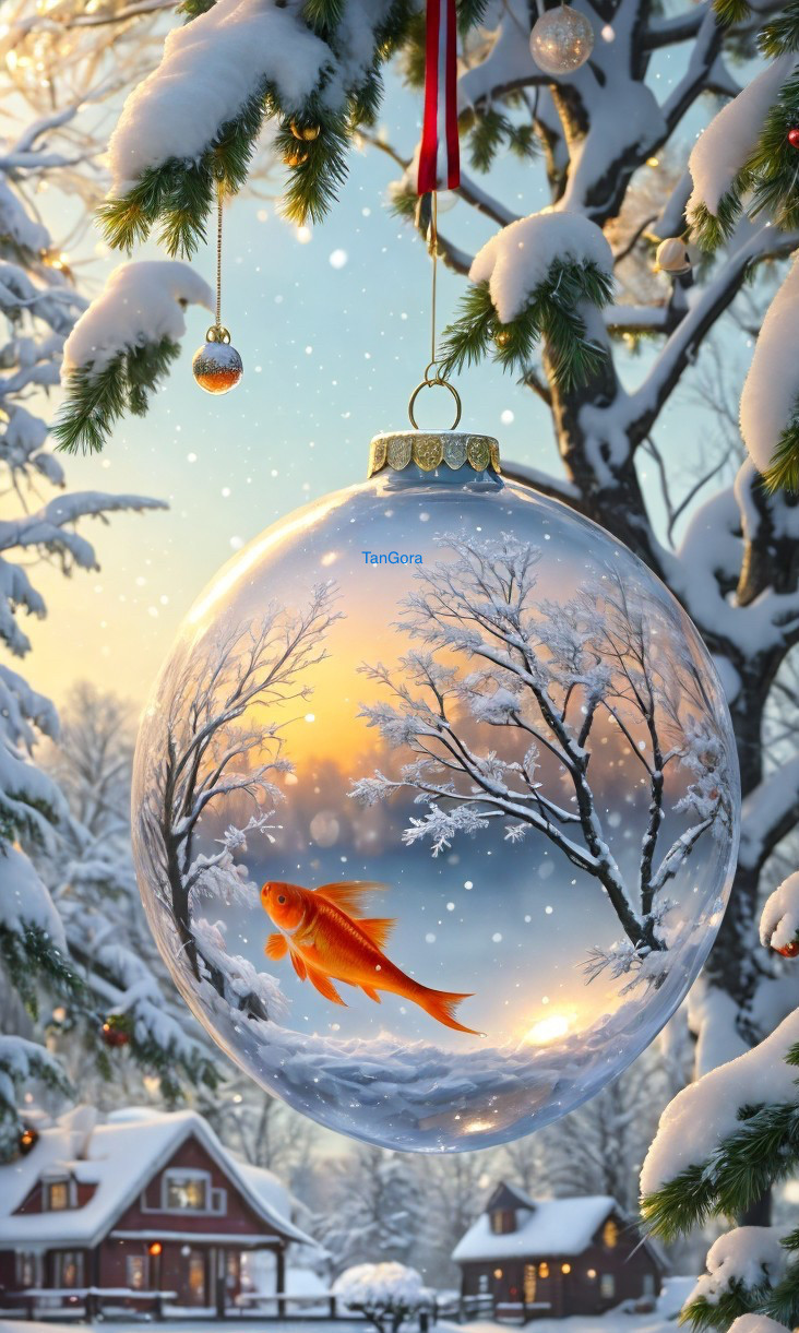 • Prompt: A Christmas ball is hanging on the tree.A Christmas tree is depicted in the upper part of the ball, and a goldfish swims in the water in the lower part of the ball. There is a beautiful winter landscape in the background