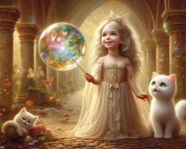 The world around her glows in soft pastel tones, with sunlight breaking gently through gray clouds.