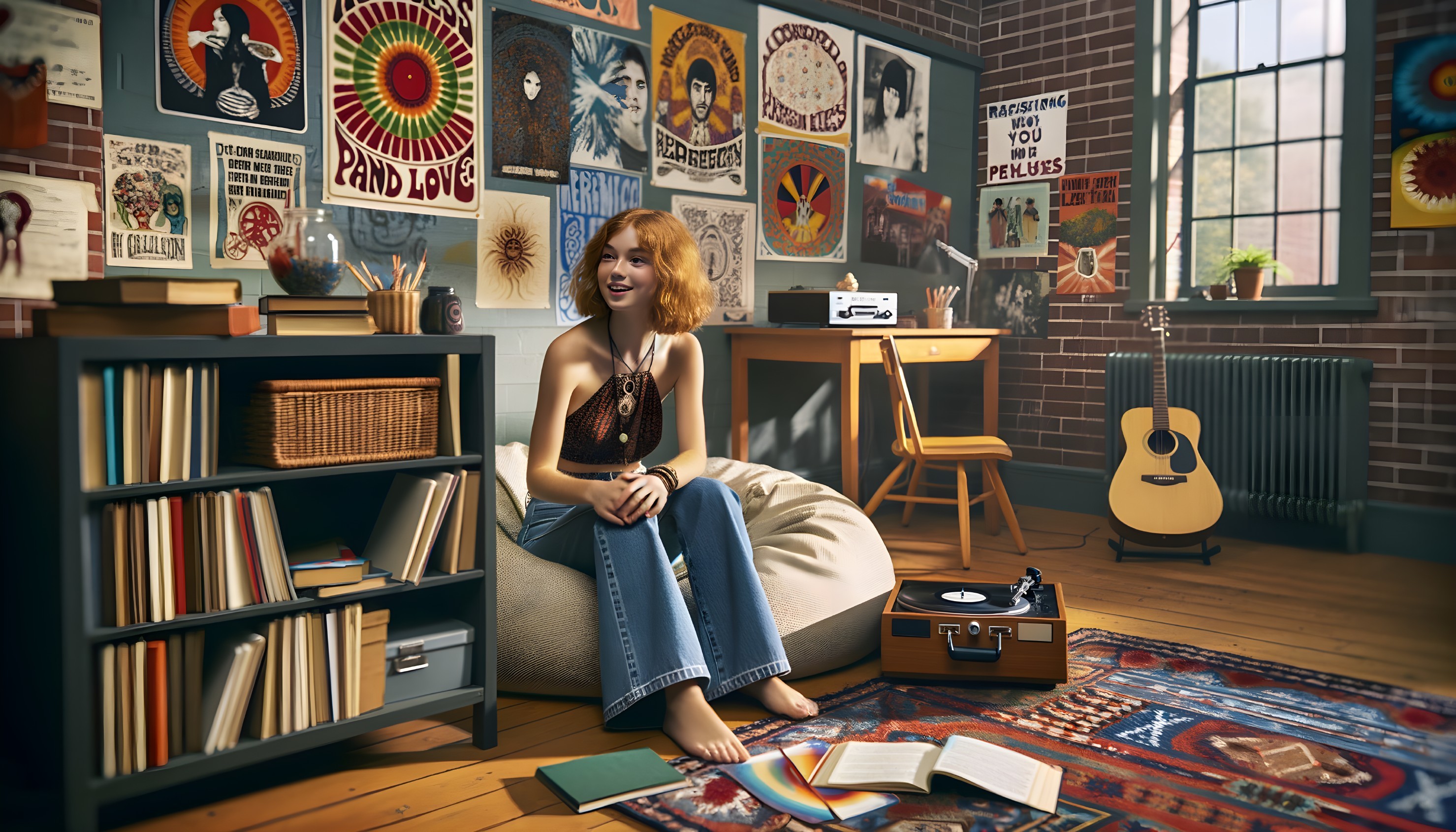 Prompt: A young, beautiful, red-haired female college student wearing a halter top and bell-bottom jeans is smoking a bong in a dorm room decorated with posters of Martin Luther King Jr. and psychedelic make love not war art on the walls There is a turntable with Vinyl records by The Beatles, Jimi Hendrix, and Janis Joplin. Books are scattered around, The furniture is simple and functional, perhaps with a beanbag chair or floor cushions for seating. A small desk cluttered with notebooks, pens, and a typewriter would be a workspace for studying or writing essays. A protest sign or two might lean against the wall, ready to be grabbed at a moment's notice for a demonstration or rally on campus. And in a corner, a guitar might be propped up, inviting impromptu jam sessions or sing-alongs with friends. Poster writing is in English.