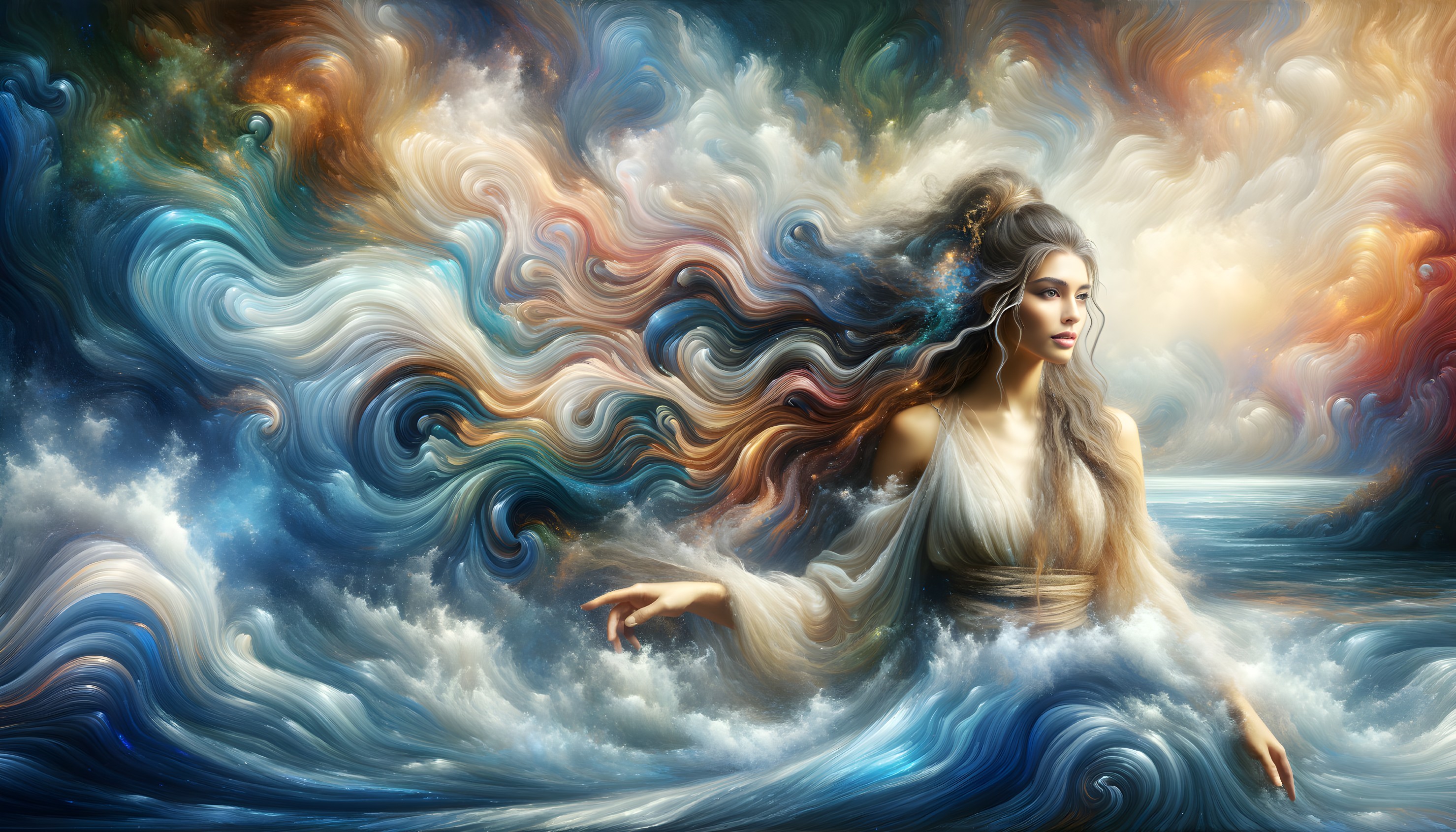 Swirling, fiery orange-red hair cascades from the head, interwoven with stylized, baroque curls and spirals in vivid shades of yellow, gold, turquoise, and deep greens, mimicking the fluidity and patterns of a sea of coral or a fiery nebula.