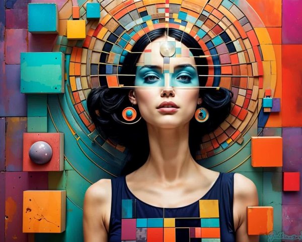 Prompt: Abstract mixed media art in intricately detailed and textured Richard Burlet style:Scott Albrecht and Peter Wileman Contemporary Art, incorporating collage and graphic shapes, offering a unique blend of styles like figurative and naive elements. By Susanne.